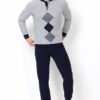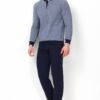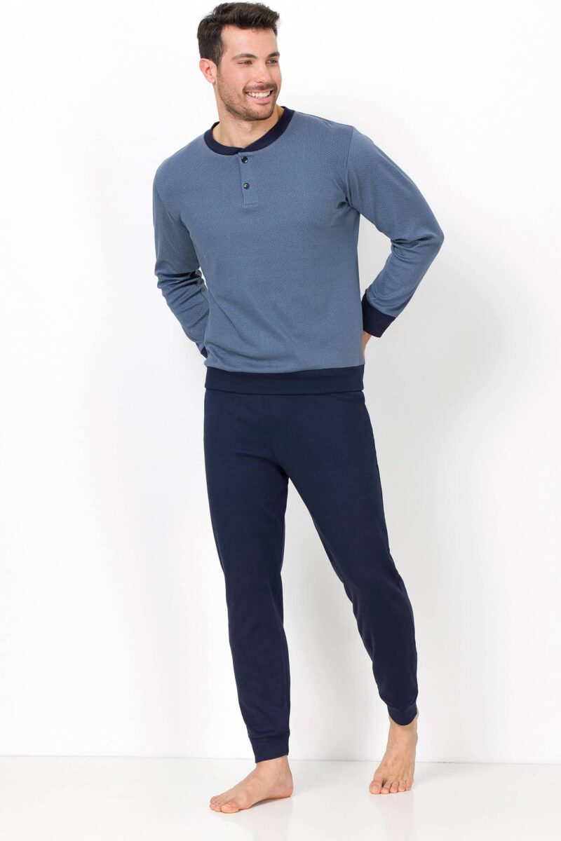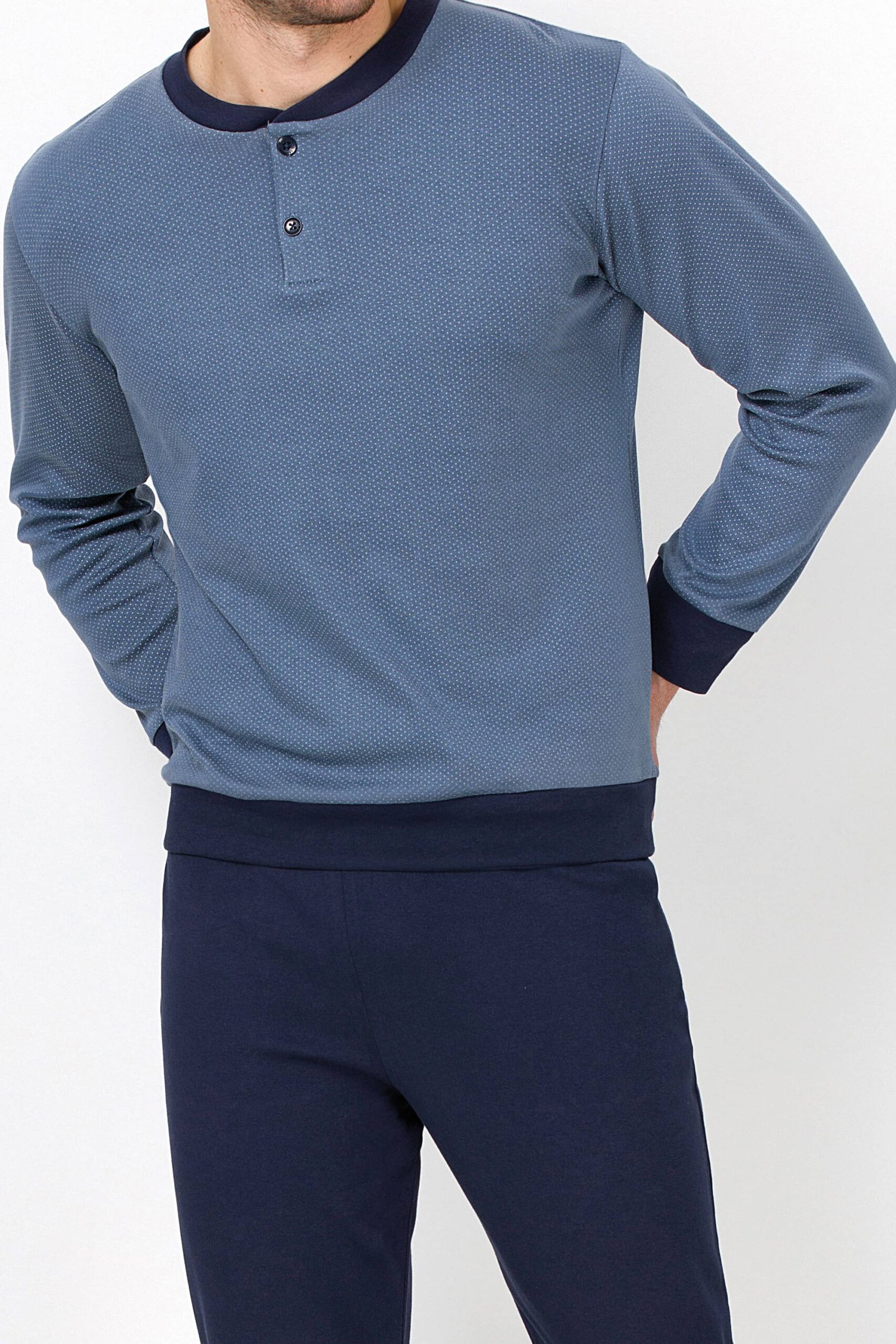 Pigiama uomo in caldo cotone interlock. Maglia stampata in piccola fantasia. Apertura a serafino 2 bottoni, collo Levis tinta unita in colore in contrasto come i morbidi polsini al bordo e alle maniche. Pantalone tinta unita, con morbido elastico coperto in vita, taschino cucito dietro e polsini alle caviglie. Disponibile nei colori avio e blu cobalto dalla taglia S alla XXL.