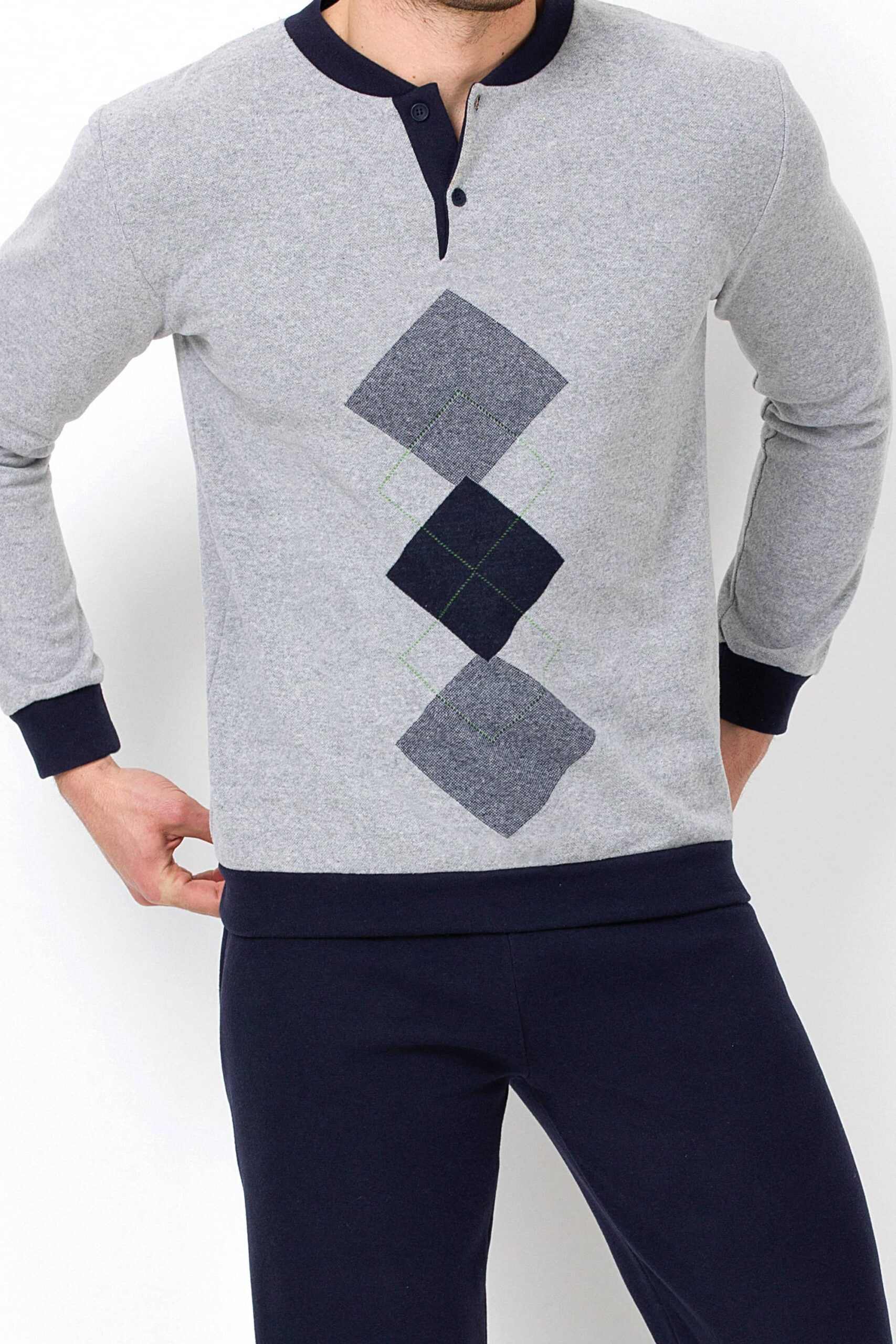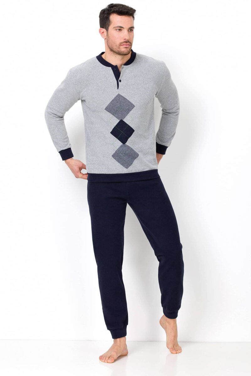 Pigiama uomo in caldo cotone interlock. Maglia stampata in piccola fantasia, con morbidi polsini tinta unita al bordo e alle maniche. Apertura a serafino. Pantalone tinta unita con polsini alle caviglie.